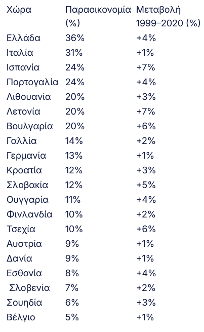 Η Ελλάδα πρώτη στην Ευρώπη σε ποσοστό παραοικονομίας με 36% του ΑΕΠ – Δείτε τον αναλυτικό πίνακα και τα στοιχεία για όλες τις χώρες της Ε.Ε..