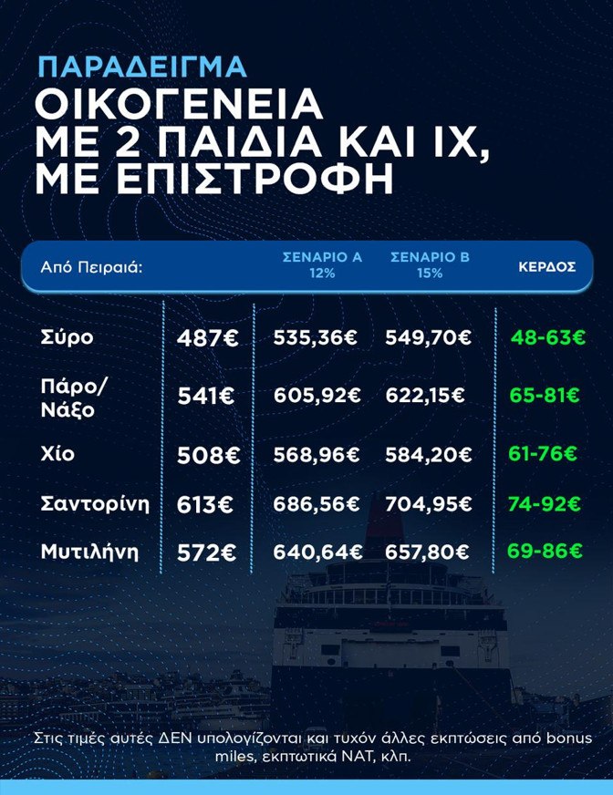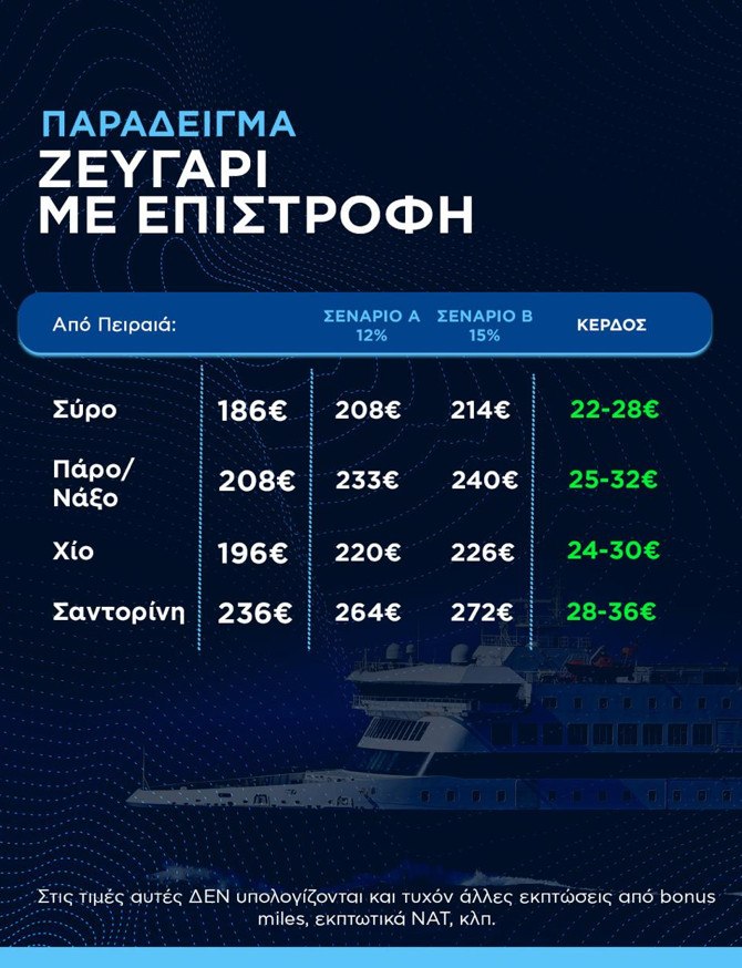 Επίσης, ένα ζευγάρι από Πειραιά για Σύρο με επιστροφή καταβάλλει σήμερα 186 ευρώ για τα εισιτήρια. Στην περίπτωση που αυξάνονταν κατα 12% η αύξηση θα ήταν στα 208 ευρώ και στο 15% στα 214 ευρώ.