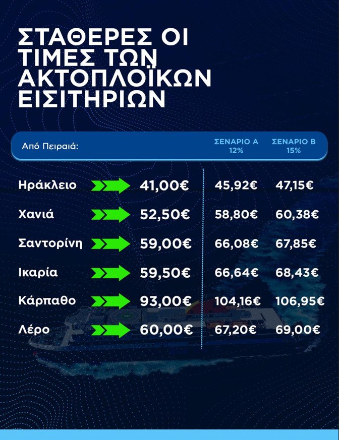 «Δεν θα υπάρξει καμία αύξηση στις τιμές των ακτοπλοϊκών εισιτηρίων, ούτε τώρα ούτε κατά τη διάρκεια της θερινής περιόδου. Εμείς μειώσαμε 50% τα λιμενικά τέλη και συγκρατήθηκαν οι τιμές», σημείωσε ο ίδιος.