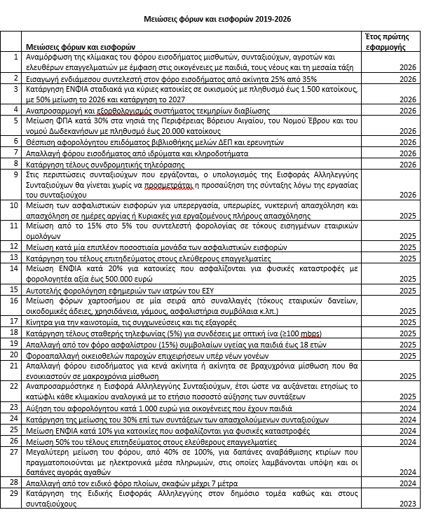 Σε 83 μειώσεις φόρων και εισφορών συνολικά έχει προχωρήσει η κυβέρνηση από την αρχή της θητείας της το 2019, με τους νέους φόρους που μειώνονται από την 1η Ιανουαρίου 2026, όπως ανακοινώθηκαν στη ΔΕΘ.