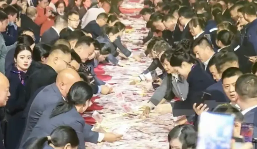 During a Chinese New Year celebration, Henan Kuangshan Crane piled up mountains of cash for 7,000 employees.