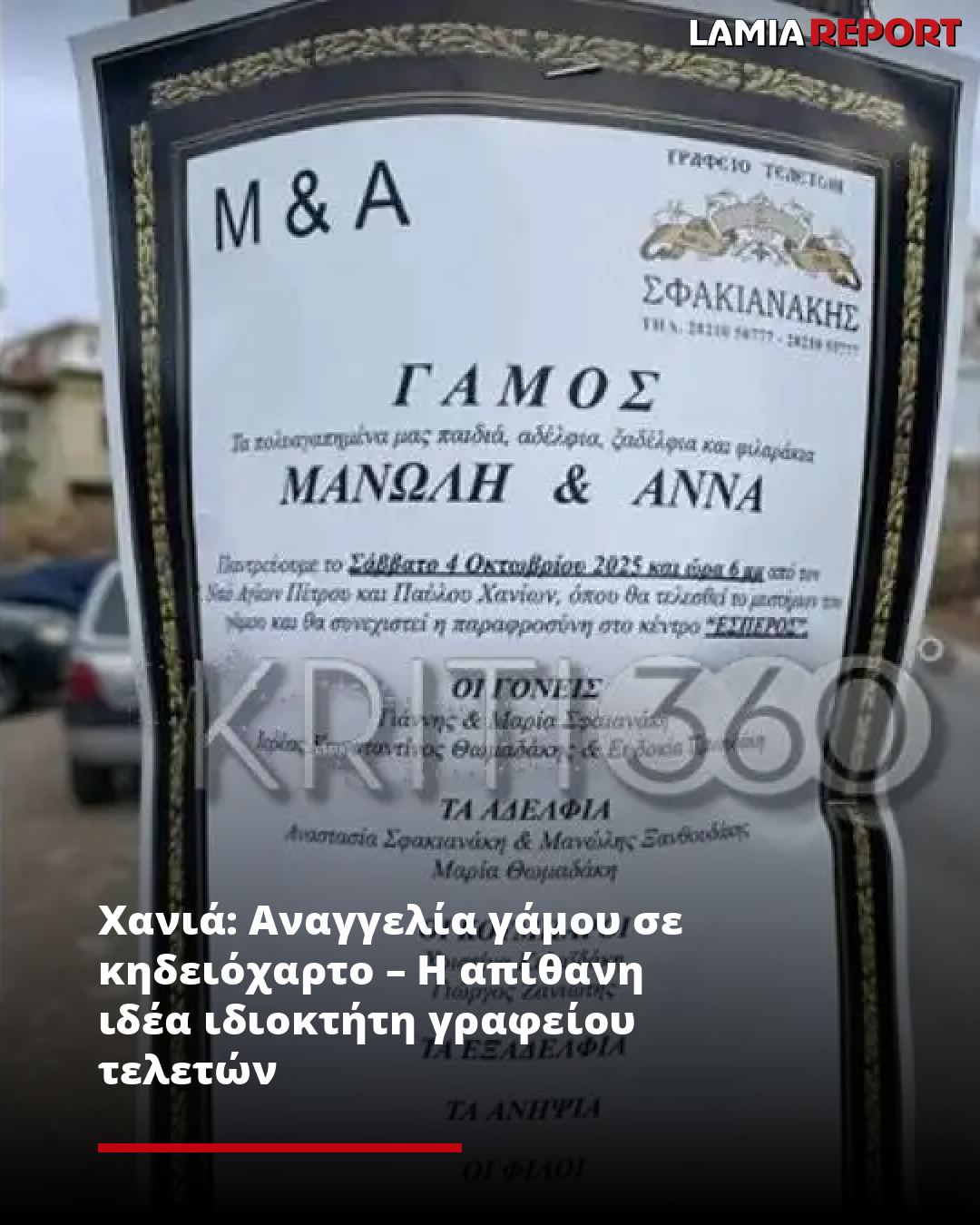 Σύμφωνα με το kriti360.gr, ο ιδιοκτήτης του γραφείου τελετών Σφακιανάκη στα Χανιά αποφάσισε να ανακοινώσει τον γάμο του γιου του σήμερα Σάββατο (4.10.25) στα Χανιά με… κηδειόχαρτο.