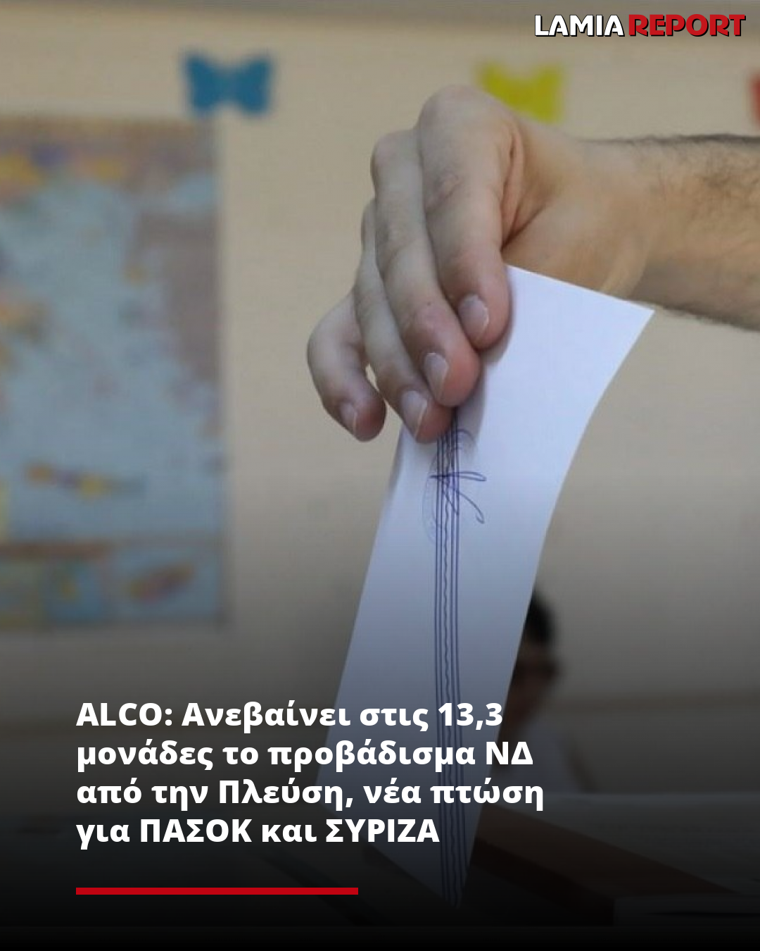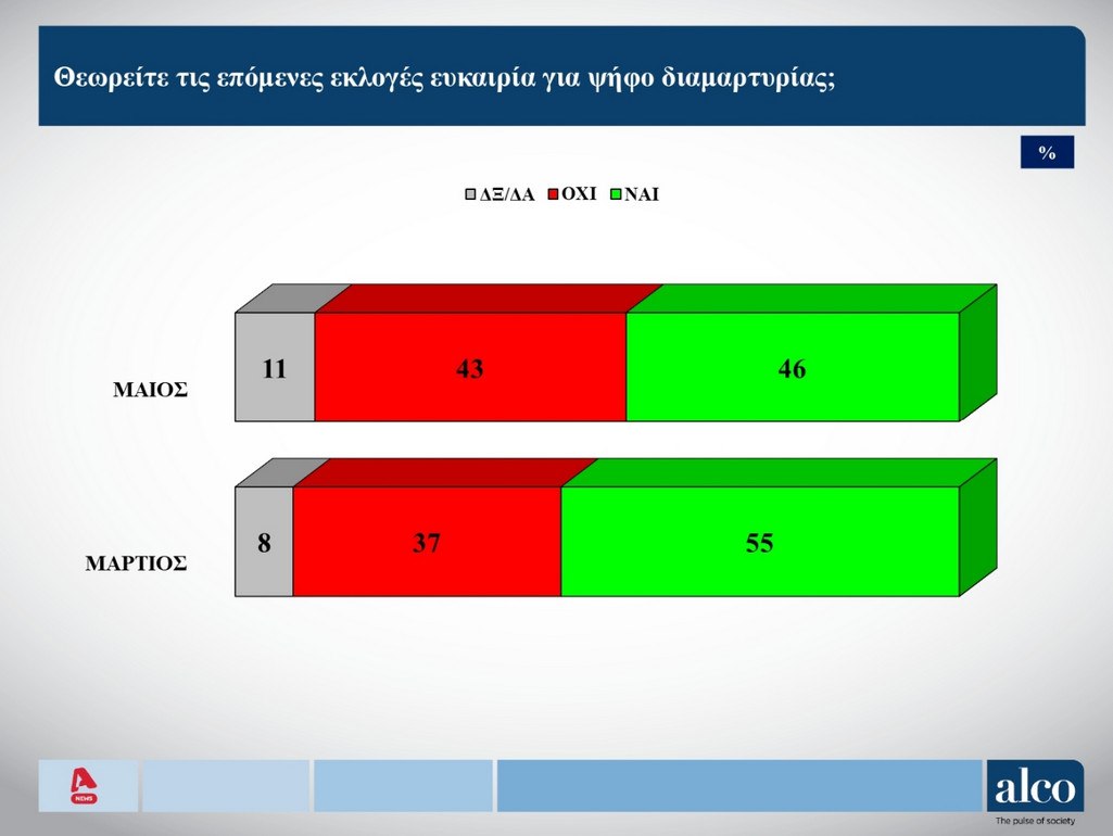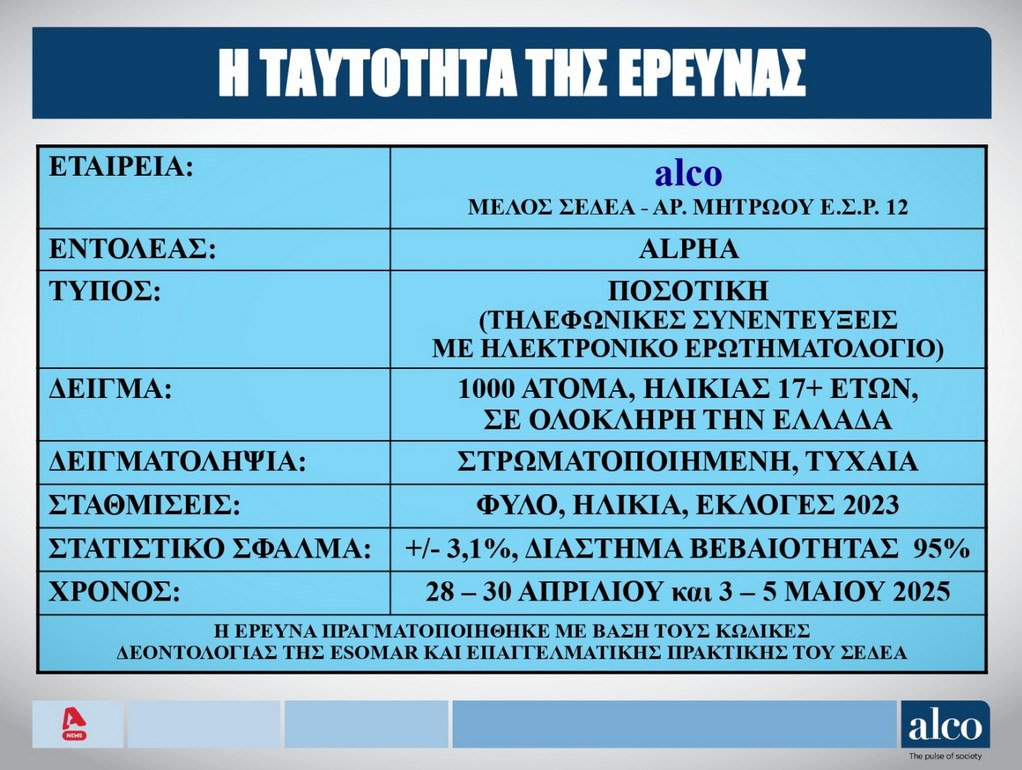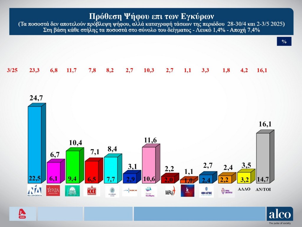 ALCO: Ανεβαίνει στις 13,3 μονάδες το προβάδισμα ΝΔ από την Πλεύση, νέα πτώση για ΠΑΣΟΚ και ΣΥΡΙΖΑ