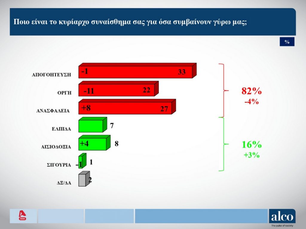 Είναι ενδιαφέρον το γεγονός ότι η εταιρεία καταγράφει σημαντική μείωση 11 μονάδων του συναισθήματος της οργής και αντίστοιχη αύξηση 8 μονάδων της ανασφάλειας στην ελληνική κοινωνία - κάτι που έχει επιπτώσεις και στην εκλογική ψυχολογία: συνολικά η λεγόμενη αντισυστημική ψήφος υποχωρεί, όπως και το ποσοστό εκείνων που δηλώνουν ότι οι επόμενες εκλογές είναι ευκαιρία για διαμαρτυρία, από το 55% του Μαρτίου, στο 46% σήμερα.