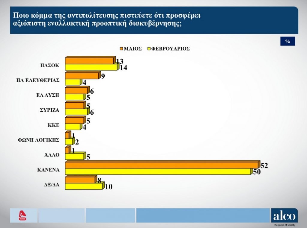 Σημειώνεται ότι το ΠΑΣΟΚ παραμένει πρώτο - αν και με πτώση - στην κατάταξη των κομμάτων της αντιπολίτευσης ως προς το κατά πόσον προσφέρουν αξιόπιστη εναλλακτική προοπτική διακυβέρνησης.
