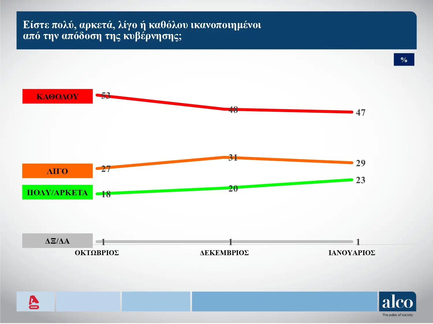 Στην ερώτηση για το κατά πόσο ικανοποιημένοι είστε με την απόδοση της κυβέρνησης το 47% λέει καθόλου, το 29% λίγο και το 23% πολύ/αρκετά.