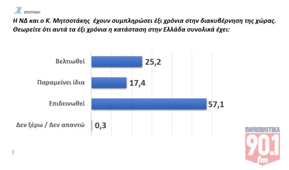 Στην δημοσκόπηση της GPO για τα Παραπολιτικά 90,1 επίσης το 57,1% εκτιμά ότι η κατάσταση στην Ελλάδα έχει επιδεινωθεί τα τελευταία 6 χρόνια, επί διακυβέρνησης ΝΔ, έναντι 25,2% που θεωρεί ότι βελτιώθηκε και 17,4% που απαντά ότι έχει μείνει η ίδια.