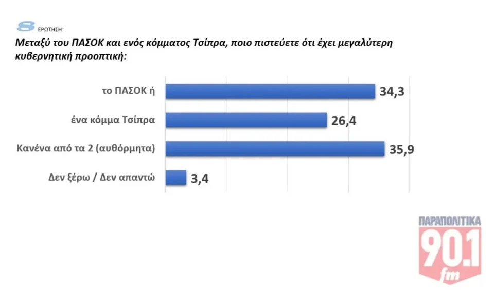 Το ΠΑΣΟΚ έχει σαφές προβάδισμα για κυβερνητική προοπτική έναντι ενός κόμματος Τσίπρα (34,3% και 26,4% αντιστοίχως). Πάντως το 35,9% απαντά «κανένα από τα δύο».
