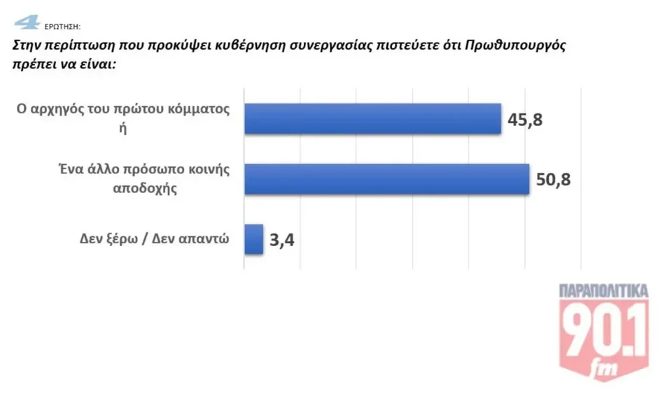 Στο ενδεχόμενο κυβέρνησης συνεργασίας πάντως, το 50,8% θέλει να οριστεί πρωθυπουργός πρόσωπο κοινής αποδοχής, έναντι 45,8% που εκτιμά ότι πρέπει να είναι ο αρχηγός του πρώτου κόμματος.