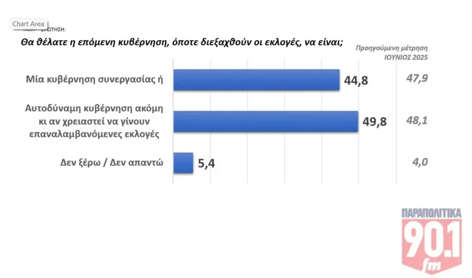 Σύμφωνα με την έρευνα σχεδόν ένας στους δύο (ποσοστό 49,8% αυξημένο σε σχέση με την προηγούμενη μέτρηση) θέλει να προκύψει αυτοδύναμη κυβέρνηση ακόμη και αν απαιτηθούν επαναλαμβανόμενες εκλογές. Αντίθετα, υποχωρεί το ποσοστό όσων θέλουν κυβέρνηση συνεργασίας (από 47,9% στο 44,8%).