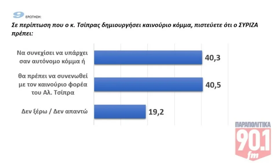 Ενδιαφέρον έχουν οι απαντήσεις για το τι πρέπει να κάνει ο ΣΥΡΙΖΑ, αν δημιουργήσει κόμμα ο Τσίπρας, καθώς είναι διχασμένοι οι πολίτες: Το 40,5% εκτιμά ότι θα πρέπει να συνενωθεί με τον καινούργιο φορέα και το 40,3% να συνεχίσει ως αυτόνομο κόμμα.