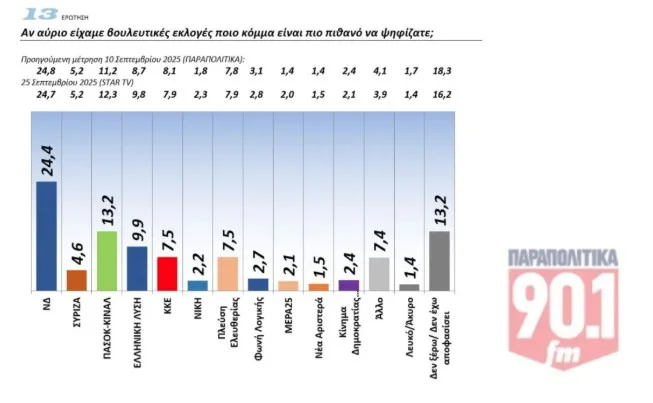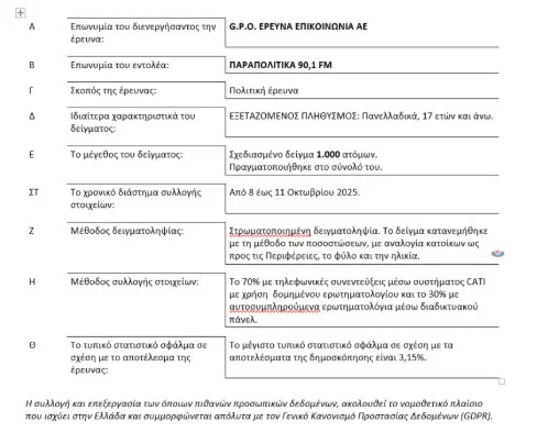 Προβάδισμα 13,2 ποσοστιαίων μονάδων από το ΠΑΣΟΚ διατηρεί η ΝΔ με εκτίμηση πρόθεσης ψήφου με αναγωγή στο 28,6% σύμφωνα με δημοσκόπηση της GPO για το ραδιόφωνο Παραπολιτικά 90,1.