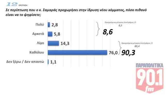 Ο Αντώνης Σαμαράς από την άλλη απευθύνεται σε ένα κοινό της τάξης του 8,6% που απαντά ότι είναι πολύ (2,8%) και αρκετά (5,8%) πιθανό να ψηφίσει ένα κόμμα υπό την ηγεσία του. Το 90,3% απαντά όχι και μάλλον όχι.