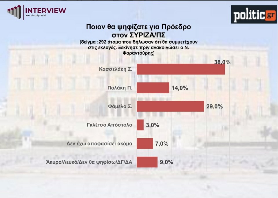 Όσον αφορά την πρόθεση ψήφου, στο ΣΥΡΙΖΑ προηγείται ο Στέφανος Κασσελάκης (38%) και με σχεδόν δέκα μονάδες κάτω ακολουθεί ο Σωκράτης Φάμελλος (29%) (η έρευνα ξεκίνησε πριν ανακοινώσει υποψηφιότητα ο Νικόλας Φαραντούρης). Τρίτος έρχεται ο Παύλος Πολάκης με 14%.