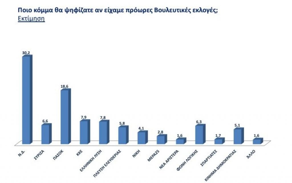 Στο 30,2% το ποσοστό της ΝΔ, στο 18,6% το ΠΑΣΟΚ - Καταλληλότερος για πρωθυπουργός ο Μητσοτάκης - Ο ΣΥΡΙΖΑ καταγράφεται στην πέμπτη θέση