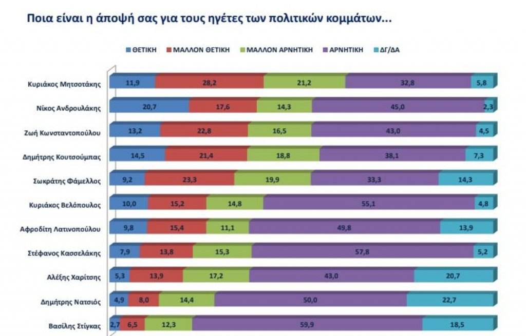 Την ίδια στιγμή, ο πρωθυπουργός, Κυριάκος Μητσοτάκης, εμφανίζεται ως ο δημοφιλέστερος πολιτικός αρχηγός με θετική άποψη που φτάνει το 40.1% . Ακολουθούν Νίκος Ανδρουλάκης με 38.3%, Ζωή Κωνσταντοπούλου με 36%, Δημήτρης Κουτσούμπας με 35.9%, Σωκράτης Φάμελλος με 32.5%, Κυριάκος Βελόπουλος και Αφροδίτη Λατινοπούλου με 25.2%, Στέφανος Κασσελάκης με 21.7%, Αλέξης Χαρίτσης με 19.2%, Δημήτρης Νατσιός με 12.9% και Βασίλης Στίγκας με 9.2%.