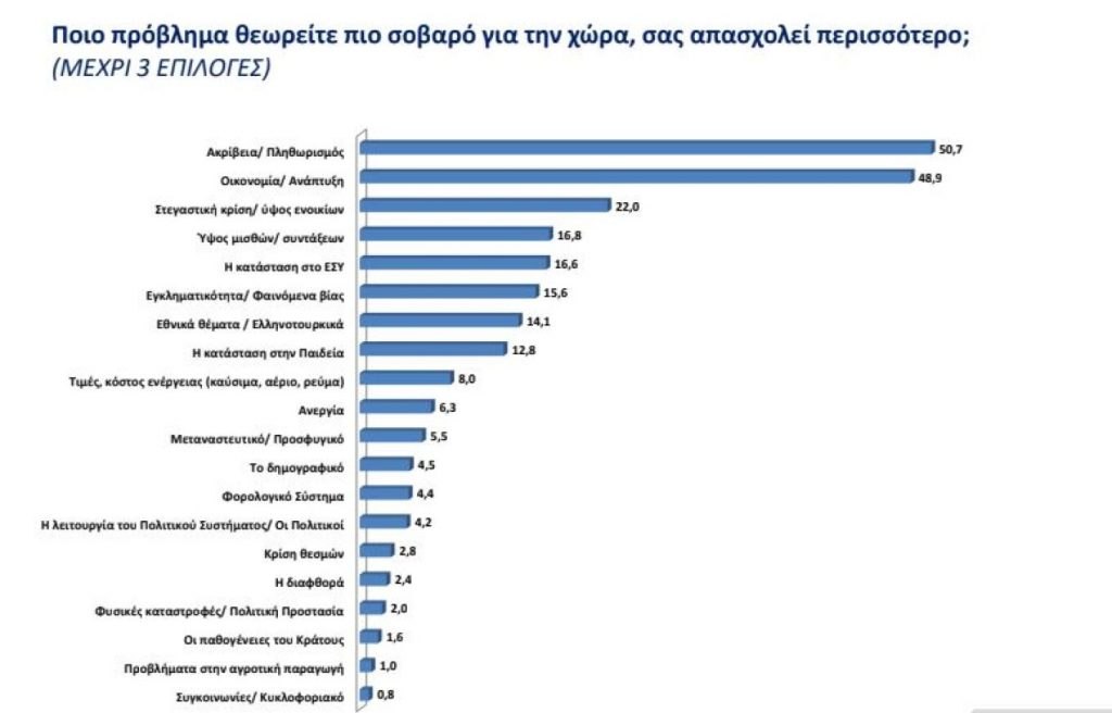 Στην δημοσκόπηση καταγράφονται και τα σημαντικότερα προβλήματα πρόβλημα για τους πολίτες με πρώτο την ακρίβεια ενώ ακολουθούν η οικονομία, η στεγαστική κρίση-ύψος ενοικίων και το ύψος των μισθών και των συντάξεων.