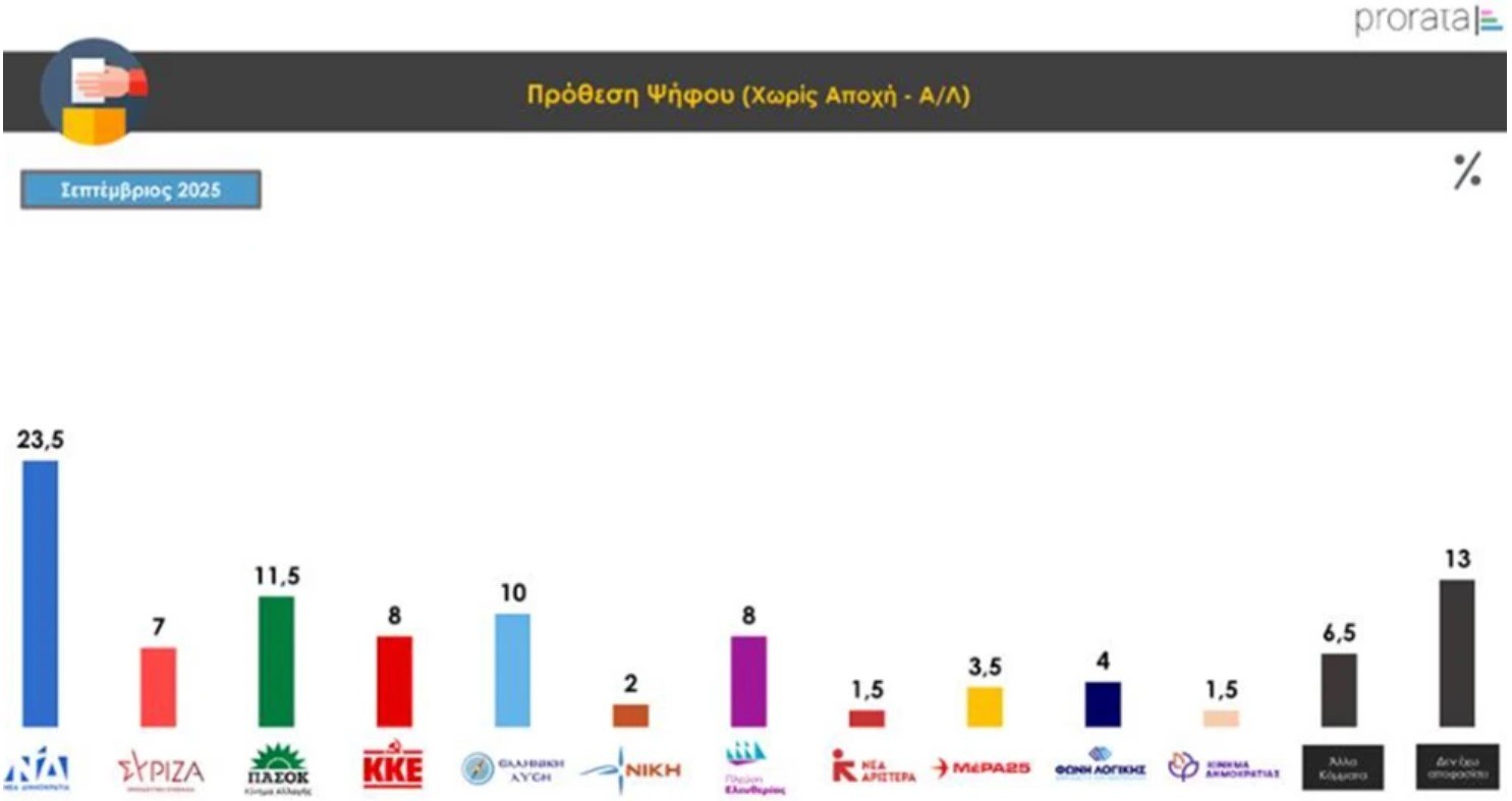 Στην πρόθεση ψήφου, στο πλαίσιο του «Σφυγμού Σεπτεμβρίου 2025», η Νέα Δημοκρατία συγκεντρώνει 23,5%, ενώ το ΠΑΣΟΚ βρίσκεται στη δεύτερη θέση με 11,5%. Ακολουθούν η Ελληνική Λύση με 10%, η Πλεύση Ελευθερίας με 8%, το ΚΚΕ επίσης με 8%, ο ΣΥΡΙΖΑ-ΠΣ με 7%, η Φωνή Λογικής με 4%, το ΜέΡΑ25 με 3,5%, η Νίκη με 2% και από 1,5% η Νέα Αριστερά και το Κίνημα Δημοκρατίας.