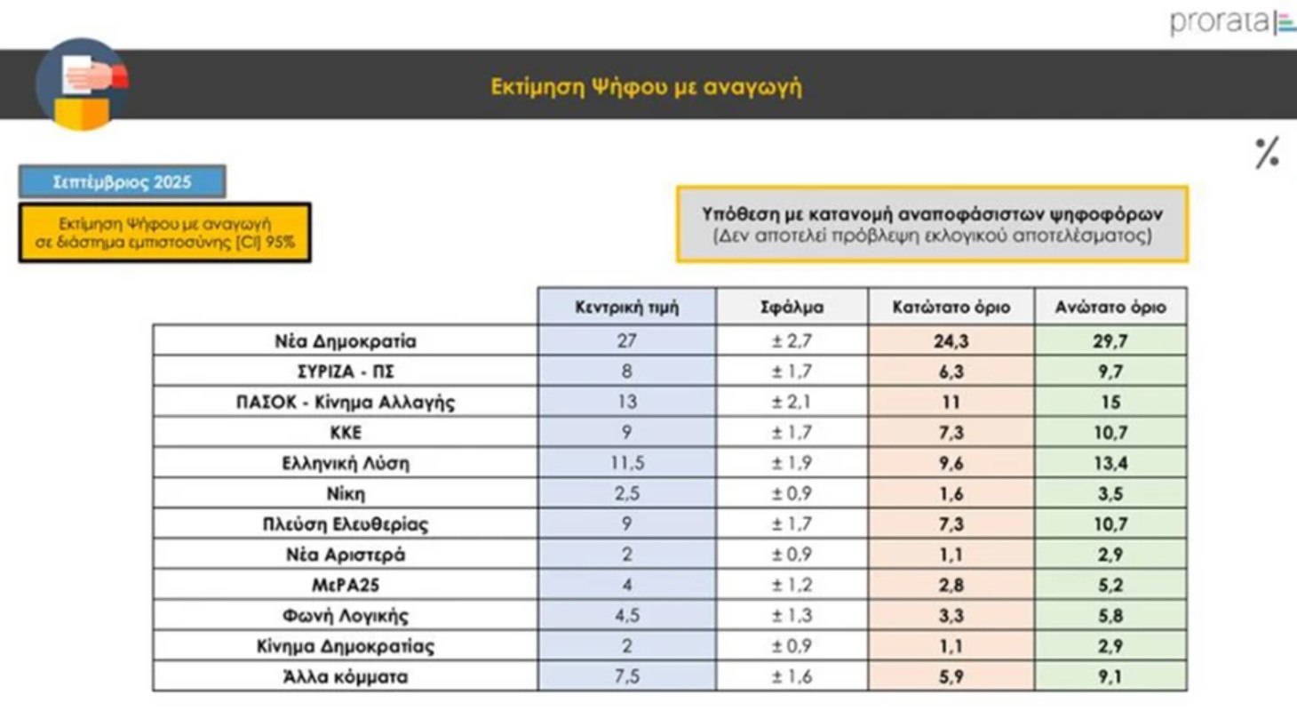 Όσον αφορά την εκτίμηση ψήφου -ένα υποθετικό σενάριο με αναλογική κατανομή των αναποφάσιστων- προκύπτει εικόνα οκτακομματικής Βουλής: η ΝΔ λαμβάνει 27%, το ΠΑΣΟΚ 13%, η Ελληνική Λύση 11,5%, η Πλεύση Ελευθερίας και το ΚΚΕ από 9%, ο ΣΥΡΙΖΑ-ΠΣ 8%, η Φωνή Λογικής 4,5% και το ΜέΡΑ25 4%. Τα υπόλοιπα κόμματα καταγράφονται κάτω από το όριο εισόδου στη Βουλή.