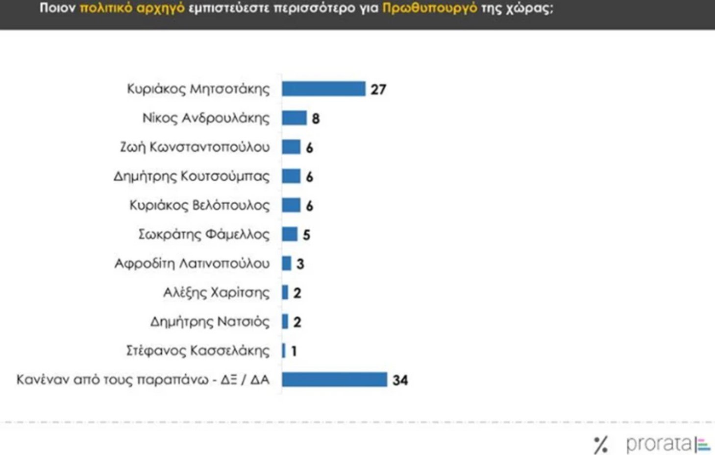 Στο ερώτημα για τον καταλληλότερο πρωθυπουργό, χωρίς τη συμμετοχή των Αλέξη Τσίπρα και Αντώνη Σαμαρά, ο Κυριάκος Μητσοτάκης συγκεντρώνει 27%, ενώ ακολουθούν ο Νίκος Ανδρουλάκης με 8% και οι Ζωή Κωνσταντοπούλου, Κυριάκος Βελόπουλος και Δημήτρης Κουτσούμπας με 6%. Όταν οι δύο πρώην πρωθυπουργοί προστίθενται στη λίστα, ο Μητσοτάκης προηγείται με 25%, ο Τσίπρας φτάνει το 11%, οι Βελόπουλος και Ανδρουλάκης 6%, ο Κουτσούμπας 5% και ο Σαμαράς 4%.