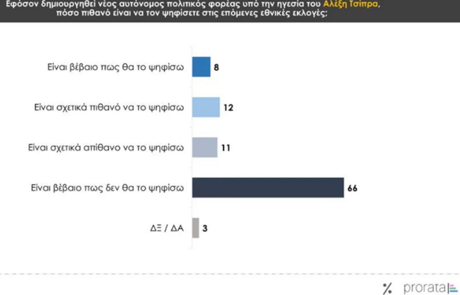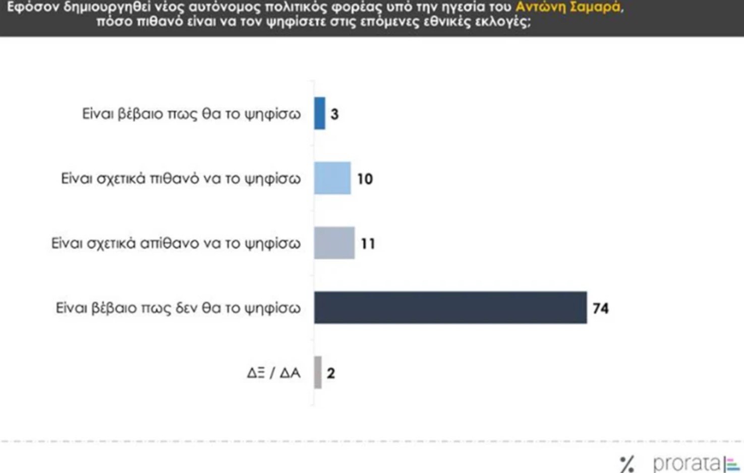 Επιπλέον, η έρευνα καταγράφει τη στάση της κοινής γνώμης απέναντι σε ενδεχόμενο ίδρυσης κόμματος από τον Αλέξη Τσίπρα και τον Αντώνη Σαμαρά. Στην περίπτωση του πρώην προέδρου του ΣΥΡΙΖΑ, το 77% δηλώνει ότι είναι σχετικά απίθανο ή σίγουρο πως δεν θα τον ψήφιζε, ενώ θετικά απαντά το 20%. Για τον πρώην πρωθυπουργό της ΝΔ, το 85% απορρίπτει την ψήφο, με μόλις 13% να δίνει θετική απάντηση.
