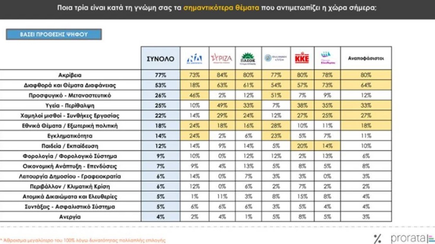 Στην κορυφή των προβλημάτων που απασχολούν την κοινωνία παραμένει η ακρίβεια, ενώ ακολουθούν η διαφθορά, η διαφάνεια, το μεταναστευτικό και το σύστημα Υγείας. Το γενικό κοινωνικό και συναισθηματικό κλίμα χαρακτηρίζεται από απογοήτευση, θυμό και απελπισία, στοιχεία που εντοπίζονται ιδιαίτερα έντονα στις νεότερες ηλικίες και στα χαμηλότερα εισοδηματικά στρώματα.
