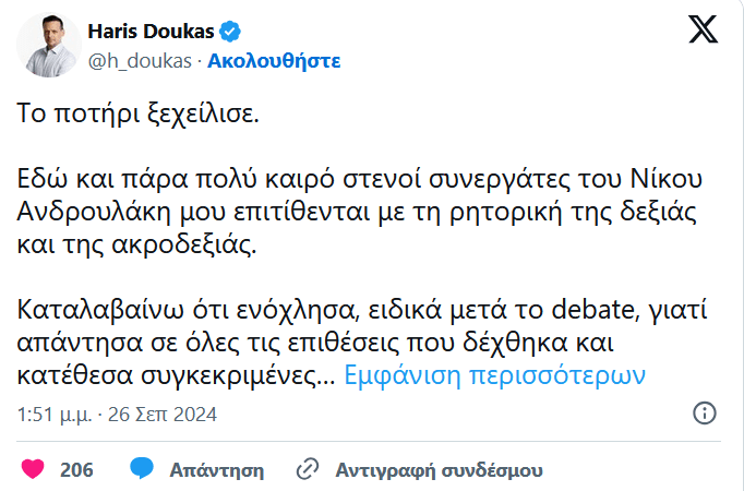 «Tο ποτήρι ξεχείλισε. Εδώ και πάρα πολύ καιρό στενοί συνεργάτες του Νίκου Ανδρουλάκη μου επιτίθενται με τη ρητορική της δεξιάς και της ακροδεξιάς.