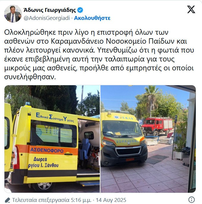 Όπως τονίζει ο Άδωνις Γεωργιάδης, επέστρεψαν όλοι οι ασθενείς στο Καραμανδάνειο Νοσοκομείο Παίδων. Ο υπουργός τονίζει ότι η πυρκαγιά, που προκάλεσε «αυτή την ταλαιπωρία για τους μικρούς ασθενείς», προήλθε από εμπρηστές οι οποίοι συνελήφθησαν.