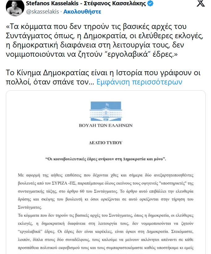 «Με αφορµή της αήθεις επιθέσεις που δέχονται χθες και σήµερα δύο ανεξαρτητοποιηθέντες βουλευτές από τον ΣΥΡΙΖΑ -ΠΣ, παραπέµπουµε όλους εκείνους τους οψιγενείς “υποστηρικτές” της συνταγµατικής τάξης, στο άρθρο 60 του Συντάγµατος.