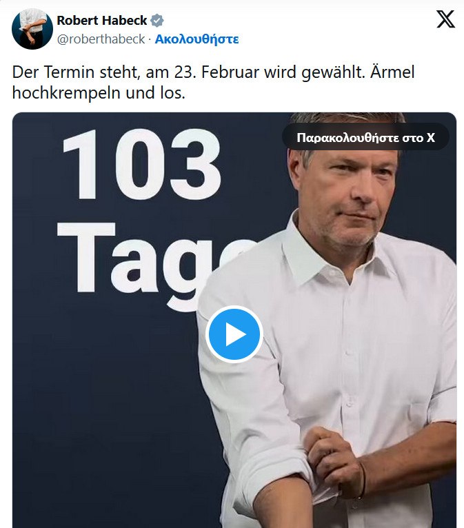 Πριν από λίγες μέρες, σε βίντεό του στα social media ο Ρόμπερτ Χάμπεκ «σηκώνει τα μανίκια» για δουλειά και μια νέα αρχή για τους Πράσινους, μετά τη φθορά στη συγκυβέρνηση και τα απογοητευτικά ποσοστά τους στις ευρωεκλογές και τις τρεις καταστροφικές για το κόμμα αναμετρήσεις στην ανατολική Γερμανία (Θουριγγία, Σαξονία, Βρανδεμβούργο).