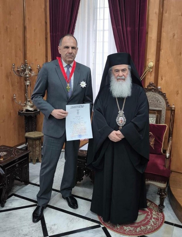 Ο υπουργός Εξωτερικών Γιώργος Γεραπετρίτης πραγματοποίησε επίσκεψη στον Ναό της Αναστάσεως και συναντήθηκε με τον πατριάρχη Ιεροσολύμων Θεόφιλο Γ', ο οποίος παρασημοφόρησε τον Έλληνα ΥΠΕΞ.
