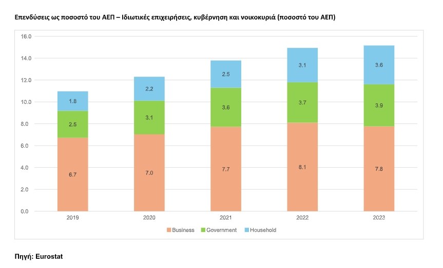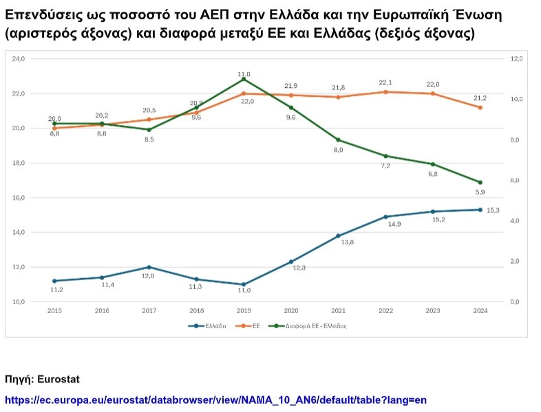 Από το 11% το 2019, οι επενδύσεις ανέβηκαν στο 15,3% του ΑΕΠ το 2024, έναντι ευρωπαϊκού μέσου όρου 21,2%.