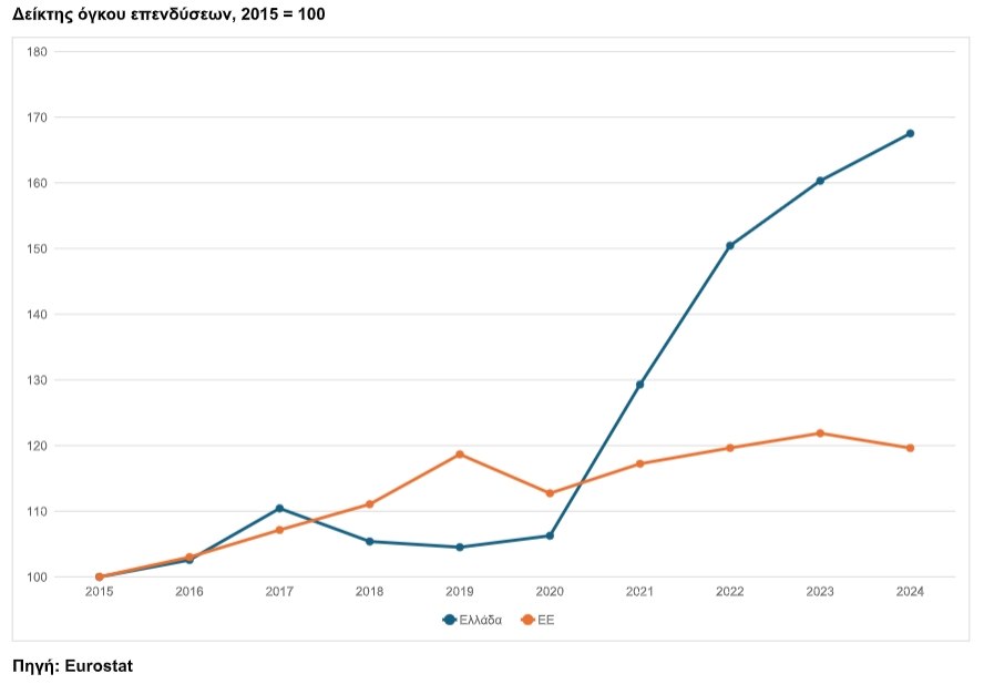 Μάλιστα η Ελλάδα είναι η χώρα της Ευρωπαϊκής Ένωσης με την μεγαλύτερη αύξηση στον όγκο επενδύσεων, σωρευτικά κατά 60% μεταξύ 2019 και 2024.