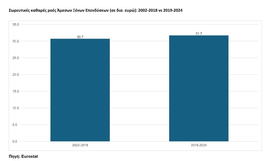 Τα τελευταία έξι χρόνια, οι καθαρές ροές άμεσων ξένων επενδύσεων, σε ονομαστικές τιμές, ανέρχονται στα 31,7 δισ. ευρώ.