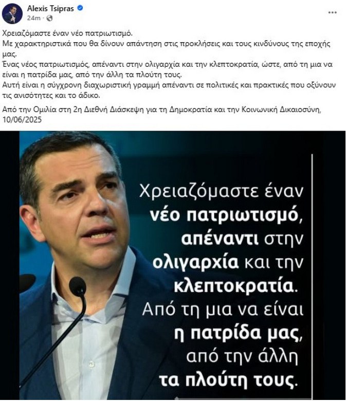 Ανακαλώντας σημεία από την ομιλία του στη 2η Διεθνή Διάσκεψη για τη Δημοκρατία και την Κοινωνική Δικαιοσύνη που διοργάνωσε το Ινστιτούτο του τον περασμένο Ιούνιο, «χρειαζόμαστε έναν νέο πατριωτισμό. Με χαρακτηριστικά που θα δίνουν απάντηση στις προκλήσεις και τους κινδύνους της εποχής μας» τόνισε στην ανάρτησή του ο κ. Τσίπρας, συμπληρώνοντας πως «ένας νέος πατριωτισμός, απέναντι στην ολιγαρχία και την κλεπτοκρατία, ώστε, από τη μια να είναι η πατρίδα μας, από την άλλη τα πλούτη τους. Αυτή είναι η σύγχρονη διαχωριστική γραμμή απέναντι σε πολιτικές και πρακτικές που οξύνουν τις ανισότητες και το άδικο».