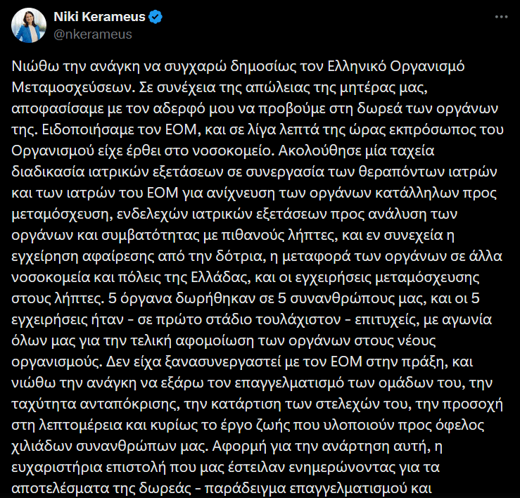 Η Νίκη Κεραμέως, ανακοίνωσε τον θάνατο του αγαπημένου της προσώπου με μια συγκινητική ανάρτηση στις 22 Ιουλίου 2025. Σήμερα (02.08.2025), η υπουργός με νέο post στο X, εκφράζει δημόσια τις ευχαριστίες της προς τον Ελληνικό Οργανισμό Μεταμοσχεύσεων, με αφορμή τη δωρεά οργάνων της μητέρας της.