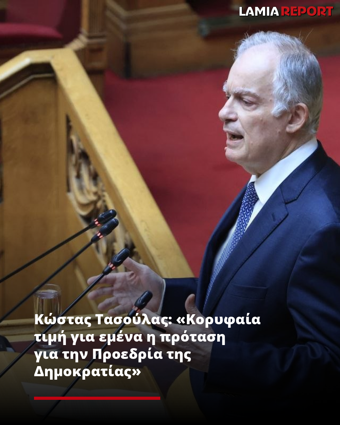 Ο Κώστας Τασούλας καταχειροκροτούμενος από τους βουλευτές της ΝΔ από το βήμα της Βουλής είπε ότι «ήθελα τη δήλωση που πρέπει να κάνω μετά την πρόταση της υποψηφιότητας μου από τον Πρωθυπουργό και πρόεδρο της ΝΔ να μην την κάνω ούτε στις κάμερες, ούτε γραπτώς ούτε στο facebook αλλά εδώ μέσα, όπου βρίσκομαι τα τελευταία 26 χρόνια χάρη στην ψήφο του Γιαννιώτικου λαού».