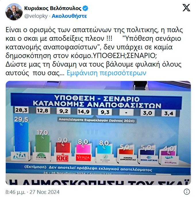 «Ο πρόεδρος της Ελληνικής Λύσης Κυριάκος Βελόπουλος με ανάρτησή του, ούτε λίγο ούτε πολύ, μας είπε ότι, όταν κυβερνήσει το κόμμα του, όποιος διαφωνεί, θα φυλακίζεται, με αφορμή τα αποτελέσματα μιας δημοσκόπησης που δεν του άρεσαν.