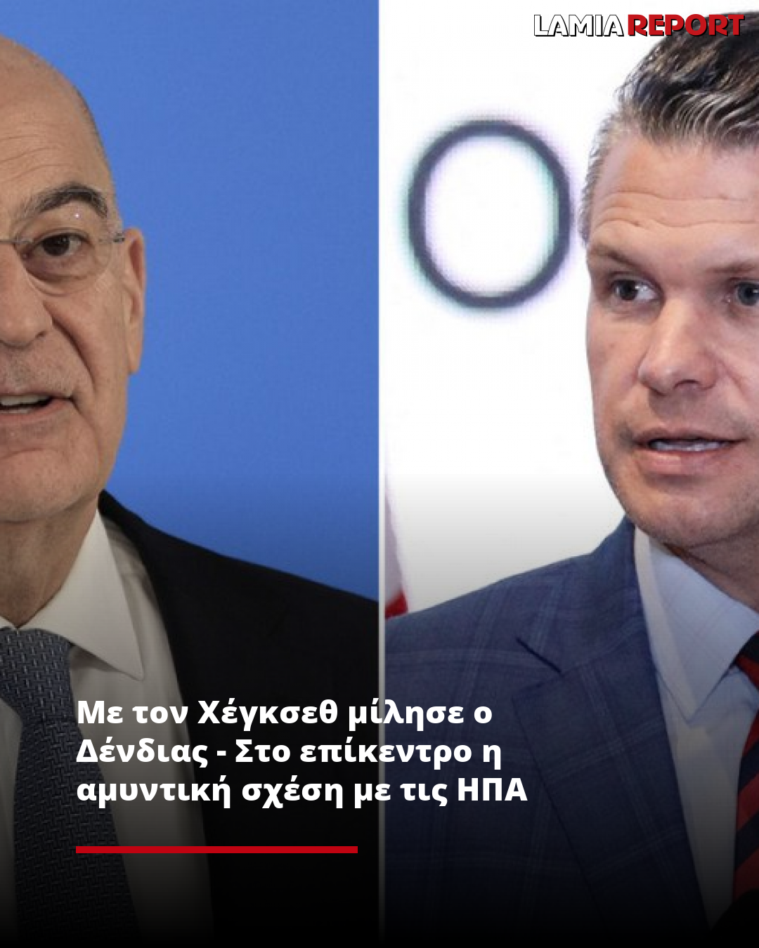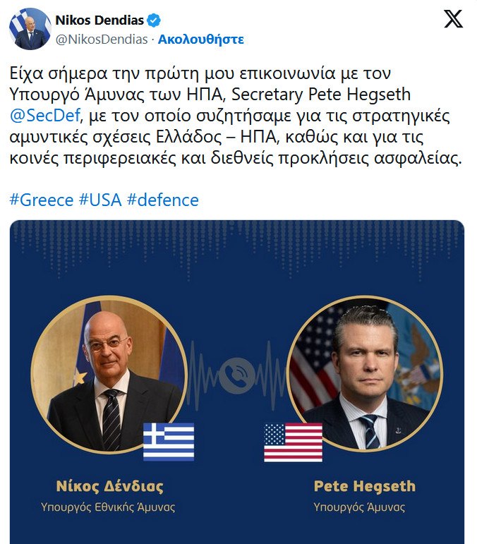 Η ανάρτηση του κ. Δένδια: «Είχα σήμερα την πρώτη μου επικοινωνία με τον Υπουργό Άμυνας των ΗΠΑ, Πιτ Χέγκσεθ, με τον οποίο συζητήσαμε για τις στρατηγικές αμυντικές σχέσεις Ελλάδος – ΗΠΑ, καθώς και για τις κοινές περιφερειακές και διεθνείς προκλήσεις ασφαλείας».