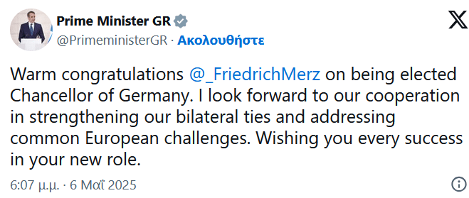 «Θερμά συγχαρητήρια @_FriedrichMerz για την εκλογή σας ως καγκελάριος της Γερμανίας. Προσβλέπω στη συνεργασία μας για την ενίσχυση των διμερών μας δεσμών και την αντιμετώπιση των κοινών ευρωπαϊκών προκλήσεων. Σας εύχομαι κάθε επιτυχία στο νέο σας ρόλο», έγραψε συγχαρητήριά του προς τον Φρίντριχ Μερτς ο Κυριάκος Μητσοτάκης.
