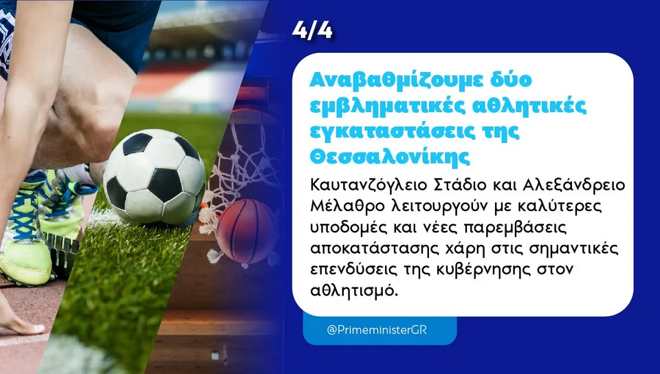 Κλείνω τη σημερινή ανασκόπηση με έργα στον τομέα του αθλητισμού. Στη Θεσσαλονίκη, το εμβληματικό Καυτανζόγλειο Στάδιο λειτουργεί ξανά με πλήρη χωρητικότητα 27.560 θεατών και, για πρώτη φορά έπειτα από 65 χρόνια, είναι πλήρως αδειοδοτημένο. Με χρηματοδότηση ύψους 11,3 εκ. ευρώ από το Υπερταμείο -πλέον των 14 εκ. που διάθεσε η Περιφέρεια- προχωρούν μεγάλες παρεμβάσεις αποκατάστασης, ανακατασκευής και ενεργειακής αναβάθμισης. Στο Αλεξάνδρειο Μέλαθρο ανανεώθηκαν οι ηλεκτρονικοί πίνακες, τοποθετήθηκαν 1.000 νέα καθίσματα και γίνονται εργασίες αναβάθμισης και εκσυγχρονισμού του γηπέδου, σε συνεργασία με τον Άρη. Παράλληλα, είναι σε εξέλιξη 5 αθλητικά έργα στους νομούς Έβρου, Μαγνησίας, Ιωαννίνων, Ηλείας και Άρτας. Και εδώ στην Αθήνα, για πρώτη φορά μετά τους Ολυμπιακούς Αγώνες του 2004, αντικαταστάθηκε όλο το ταρτάν στις προπονητικές εγκαταστάσεις του ΟΑΚΑ, στο πλαίσιο της συνολικής αναβάθμισης των εγκαταστάσεών του, ύψους άνω των 150 εκ. ευρώ από το Ταμείο Ανάκαμψης.