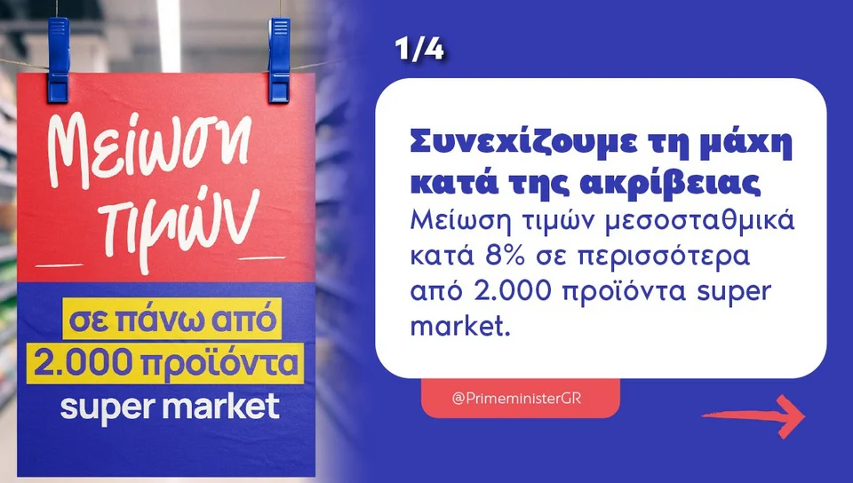 Ξεκινώ από το μέτωπο της ακρίβειας και τη συμφωνία που πέτυχε το Υπουργείο Ανάπτυξης με όλες τις αλυσίδες σούπερ μάρκετ, να διπλασιαστεί ο αριθμός των βασικών προϊόντων με μειωμένες τιμές, από 1.000 σε παραπάνω από 2.000 κωδικούς. Η συμφωνία καλύπτει είδη διατροφής, προϊόντα καθαριότητας και ατομικής υγιεινής, κατηγορίες που απορροφούν το μεγαλύτερο μέρος του οικογενειακού προϋπολογισμού. Παράλληλα, οι έλεγχοι της ΔΙΜΕΑ συνεχίζονται και όπου εντοπίζονται παραβάσεις επιβάλλονται πρόστιμα. Μέσα σε ένα δύσκολο διεθνές περιβάλλον, δίνουμε συνεχή μάχη για τη συγκράτηση των τιμών, ιδιαίτερα στα βασικά είδη διαβίωσης.