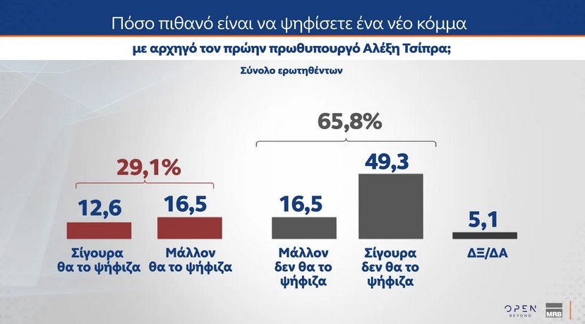 Στο δεύτερο μέρος στη δημοσκόπηση της MRB για το κεντρικό δελτίο ειδήσεων του Open το 65,8% απαντά πως μάλλον ή σίγουρα δεν θα ψήφιζε πιθανό κόμμα με αρχηγό τον Αλέξη Τσίπρα, ενώ το 29,1% πως μάλλον ή σίγουρα θα ψήφιζε. Το 5,1% απαντά πως δεν γνωρίζει.