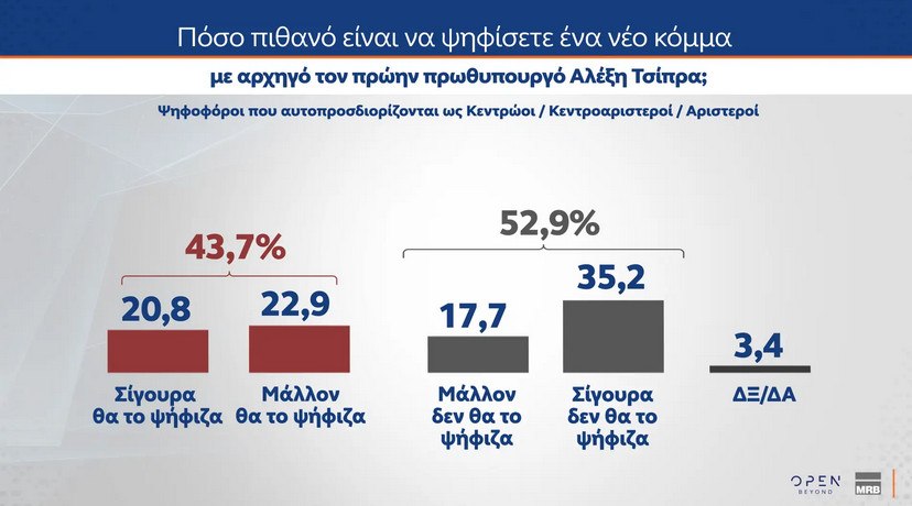 Ανάμεσα στους ψηφοφόρους που προσδιορίζονται ως κεντρώοι/κεντροαριστεροί ή αριστεροί, το 52,9% απαντά πως σίγουρα ή μάλλον δεν θα ψήφιζε ένα νέο κόμμα υπό τον Τσίπρα, ενώ το 43,7% πως μάλλον ή σίγουρα θα ψήφιζε.