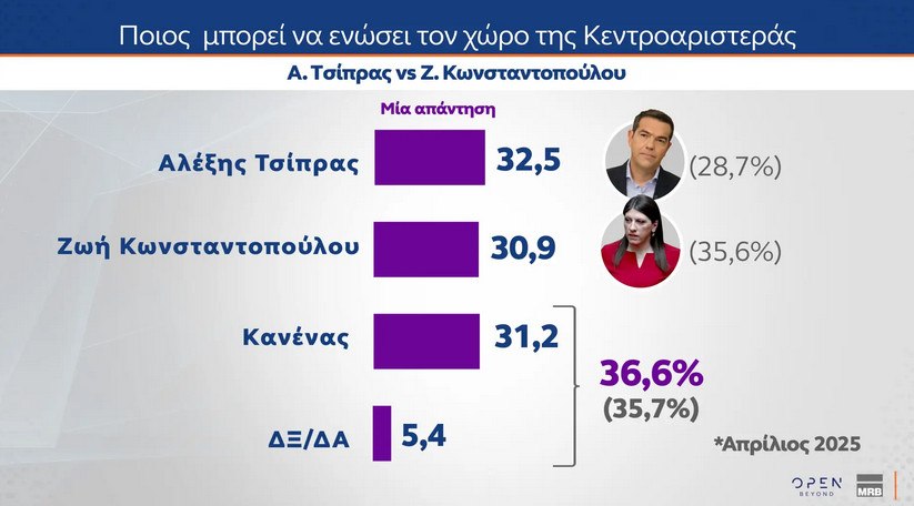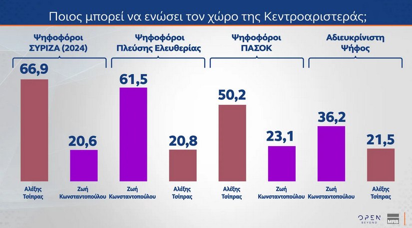Αναφορικά με το ποιος μπορεί να ενώσει το χώρο της κεντροαριστεράς και στο δίπολο Αλέξης Τσίπρας και Ζωή Κωνσταντοπούλου, το 32,5% προτιμά τον πρώην πρωθυπουργό, ενώ το 30,9% την πρόεδρο της Πλεύσης Ελευθερίας.