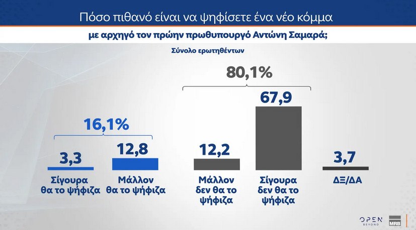 Από την άλλη το 80,1% απαντά πως μάλλον και σίγουρα δεν θα ψήφιζε ένα νέο κόμμα υπό τον Αντώνη Σαμαρά, ενώ το 16,1% απαντά πως μάλλον ή σίγουρα θα το ψήφιζε.