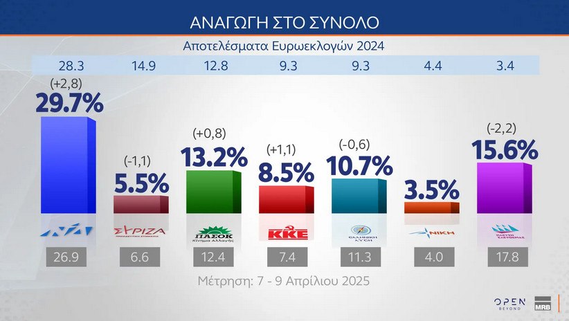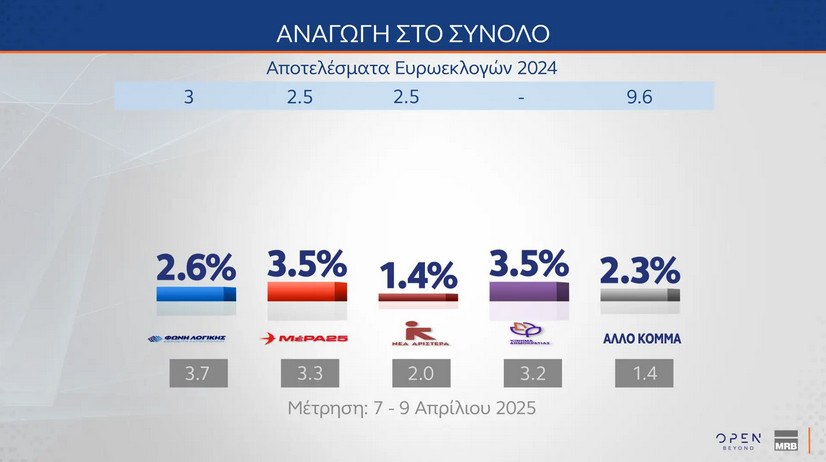 Η ΝΔ δίνει 4,3% στην Πλεύση Ελευθερίας, 3,9% στην Ελληνική Λύση, 3,8% στο ΠΑΣΟΚ και 2,1% στη Φωνή Λογικής. Το 4,7% κατευθύνεται προς την αδιευκρίνιστη ψήφο και το 3,7% προς άλλο κόμμα.