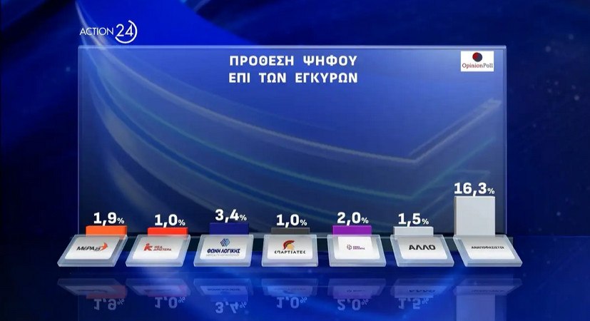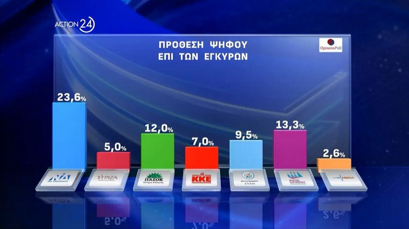Συγκεκριμένα στην εκτίμηση ψήφου για τη δημοσκόπηση της Opinion Poll που παρουσίασε το Action24 η Νέα Δημοκρατία έχει ποσοστό 28,1% και ακολουθεί η Πλεύση Ελευθερίας με 15.9% και το ΠΑΣΟΚ με 14,3%.