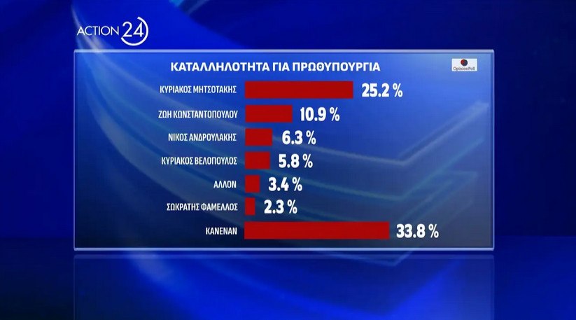 Στην καταλληλότητα για πρωθυπουργία το 25,2% λέει Κυριάκος Μητσοτάκης και ακολουθούν η Ζωή Κωνσταντοπούλου με 10,9%, ο Νίκος Ανδρουλάκης 6,3%, ο Κυριάκος Βελόπουλος με 5,8% ενώ ο κανένας έχει ποσοστό 33,8%