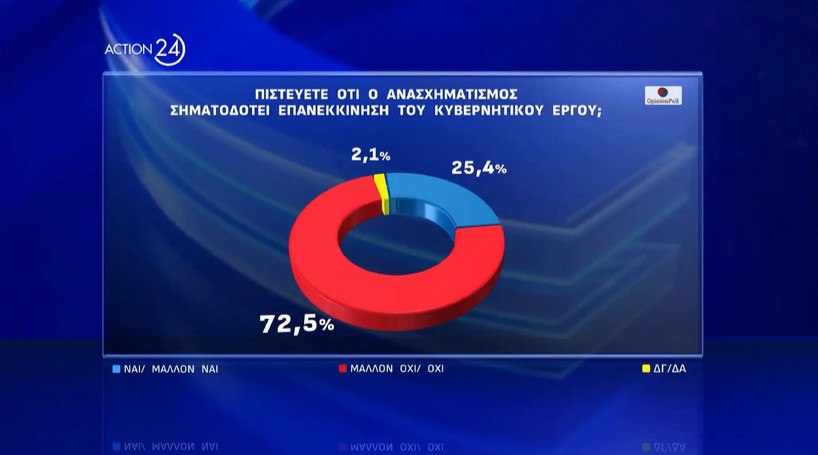 Αναφορικά με τον ανασχηματισμό και αν σηματοδοτεί επανεκκίνηση του κυβερνητικού έργου το 72,5% λέει όχι και μάλλον όχι ενώ το 25,4% ναι και μάλλον ναι.